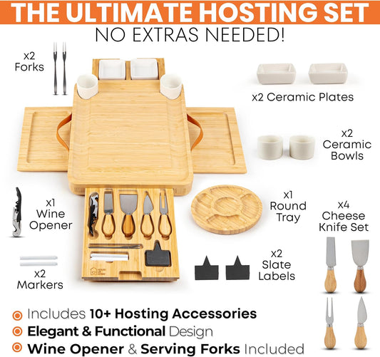 Large Bamboo Charcuterie Boards Gift Set with 4 Hidden Drawers, Cheese Knives, Ceramic Bowls & Plates, Recipe Book, Perfect House Warming Gifts New Home
