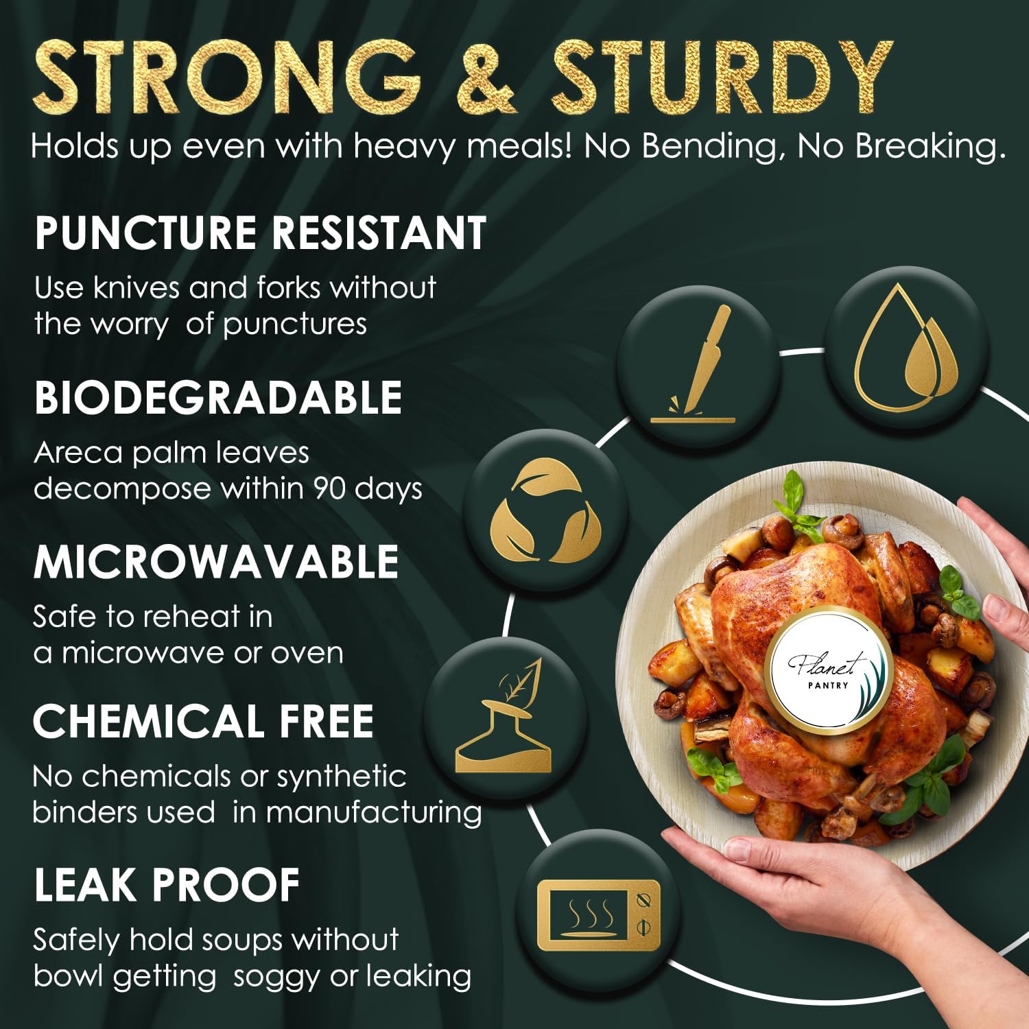 - SUSTAINABLE: They are made from naturally fallen leaves of the Areca Palm tree. Compostable and biodegradable, Good for the planet, from start to finish!