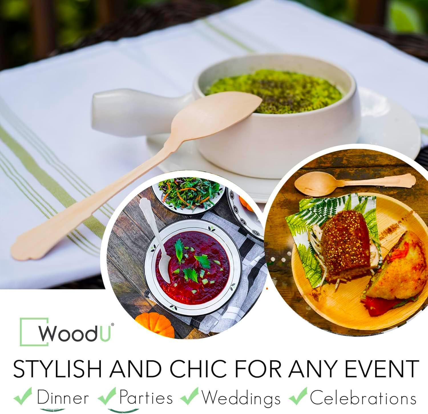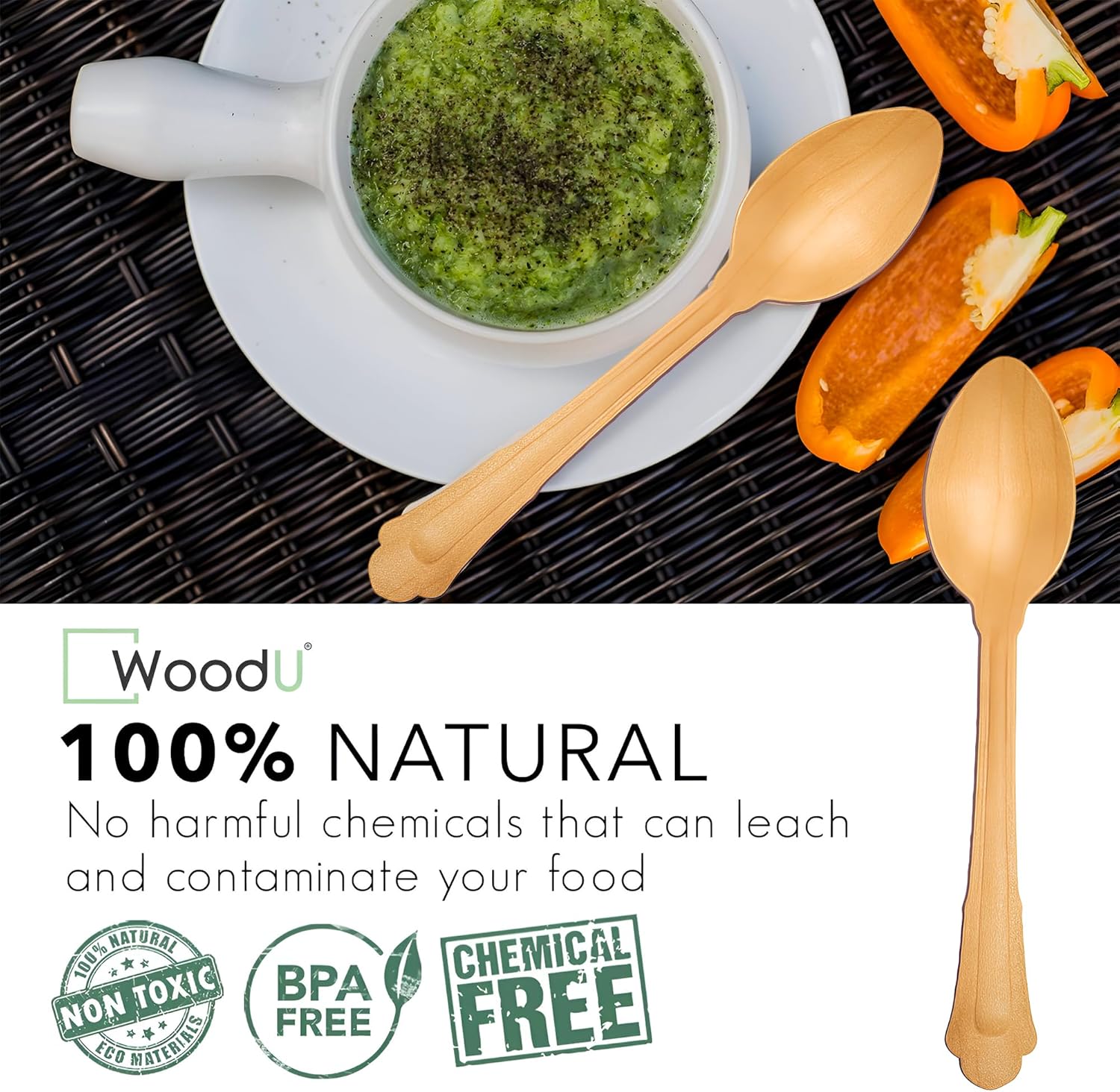 - Natural Elegance: Embrace eco-friendly dining with WoodU's Wooden Disposable Spoons. Crafted from 100% natural birch wood tasting spoons, these 7.75-inch spoons combine style and sustainability for any occasion.