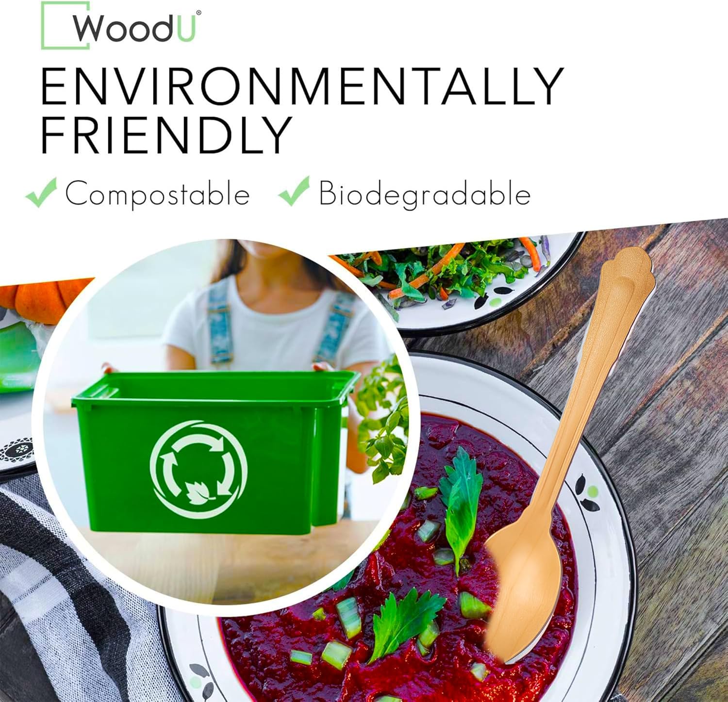 - Earth's Allies: With WoodU Wooden Spoons Join the fight against plastic waste. By choosing these compostable spoons, you're choosing a greener future. Return nutrients to the Earth while enjoying your favorite foods.
